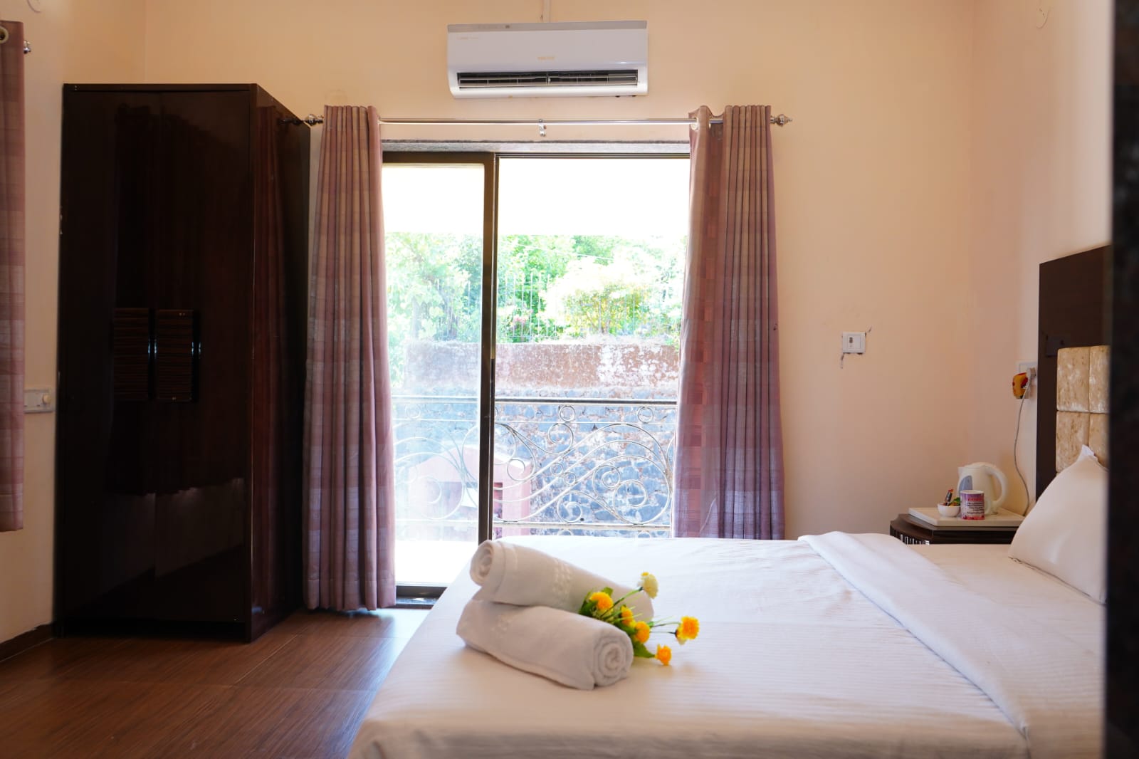 features a queen bed and an attached bathroom, ensuring comfort aComplimentary toiletries, along with fresh towels for your convenience. This room also boasts a private balcony, perfect for enjoying scenic views.